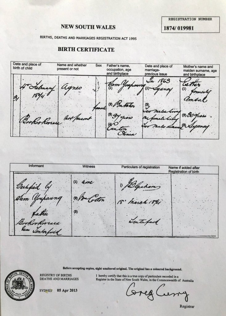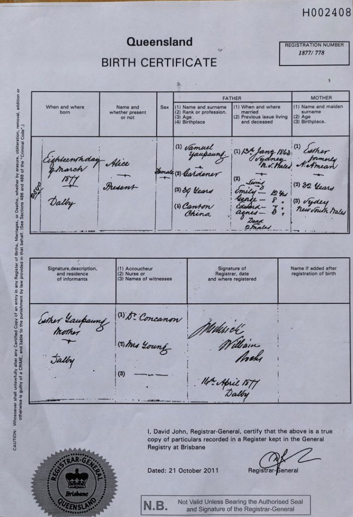 A wealth of information can be gleaned from the great number of birth certificates of their offspring. Esther and Samuel had 9 children. The documents describe their mobility and their opportunism. Of note is the variety of jobs that Samuel transitions through including storekeeper, miner, vegetable gardener, and butcher. Also, how his name and the names of the children change from being predominantly European names to becoming more Chinese. This initially reflects Samuel’s need to fit-in, and then later, he may well have acknowledged his Chinese roots.