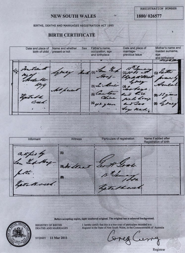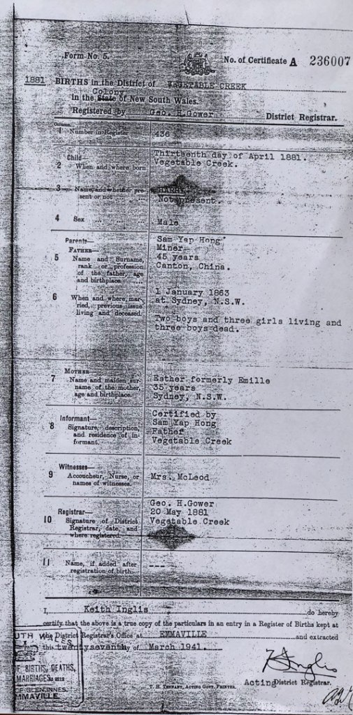 It is shortly after the birth of Harry Hong in 1881 that all traces of Samuel vanish and it’s assumed that he likely died in Emmaville and could well be buried in one of the many unmarked Chinese graves.