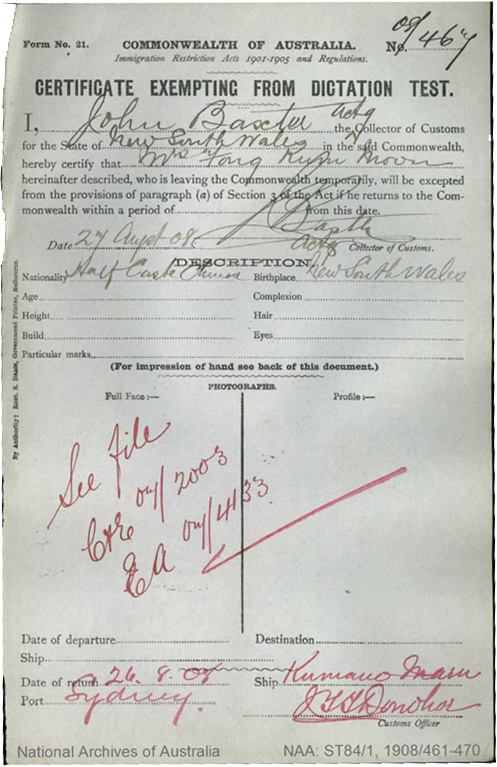 I pointed out that Ellen Mon How was sometimes addressed as Mrs Moon and Mon How her husband was known as Fong Mon How, a storekeeper in Inverell and Tingha region at the time. We collaborated with some detective work, and I was able to locate on the National Australian Archive site this Certificate Exempting from Dictation test for a Mrs Fong Kum Moon – a Half-Caste Chinese, born in NSW – unfortunate the relevant photos and connected files are missing so it’s not the slam dunk we were hoping for, however, there’s plenty of circumstantial evidence in my collection to support that Fong Kum Moon and Mon How are one and the same person. Kum Moon being a curtesy name.