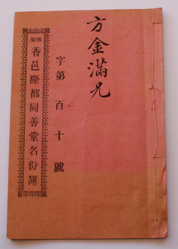 This 1905 membership booklet for the Sydney Long Du Association. Originally thought that all of the objects in my collection were connected only with Chen Quin Jack, however it seems that this membership booklet was inscribed and we have since discovered that it belonged to a Fung Gum Moon ⽅⾦滿 (Fang Jinman) — AKA 金滿 “Kum Moon” — from Ho Chung 濠涌 (Hao Yong) village in the south China district of Long Du (隆都).