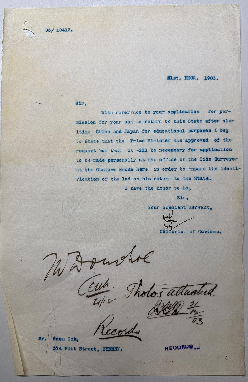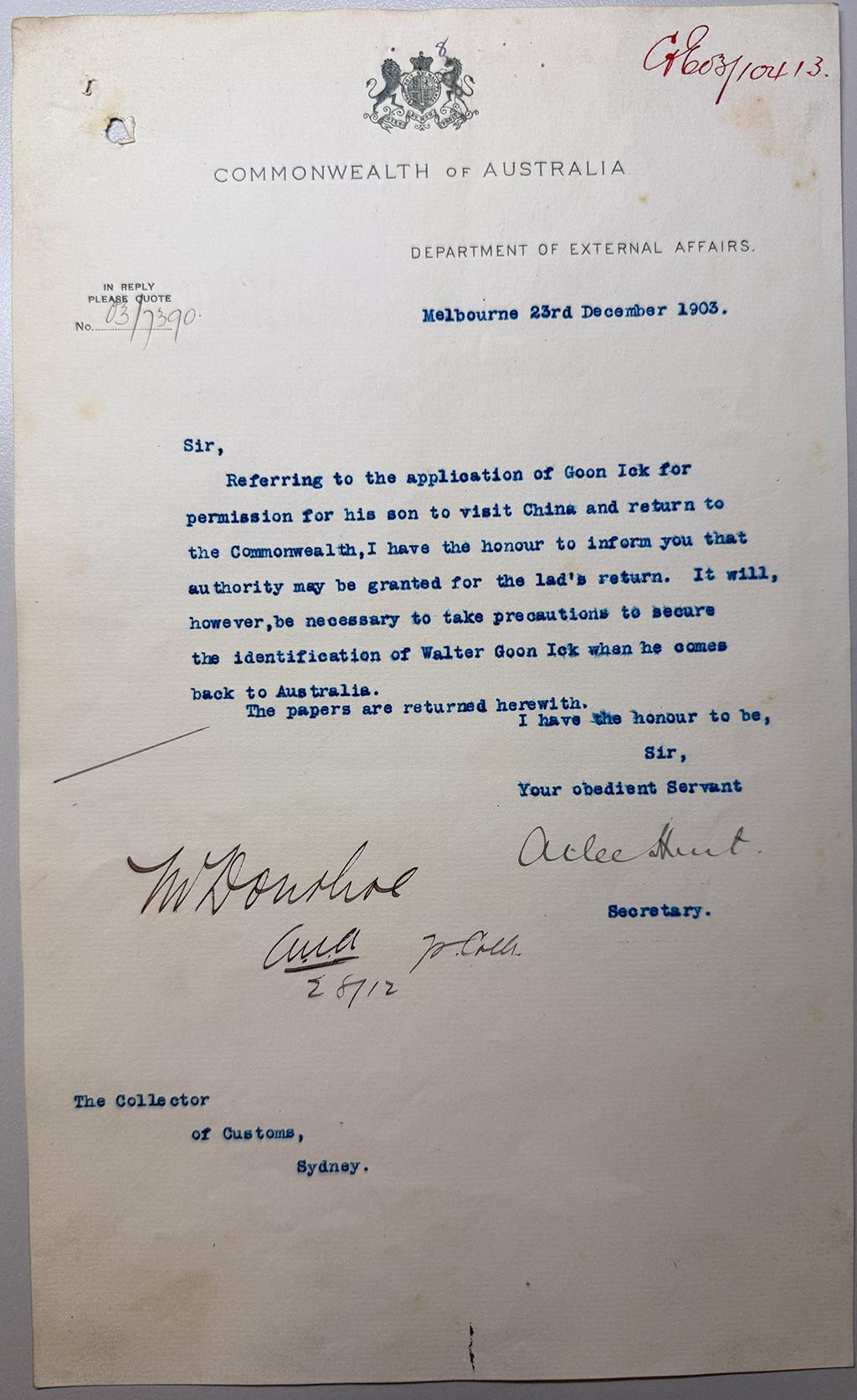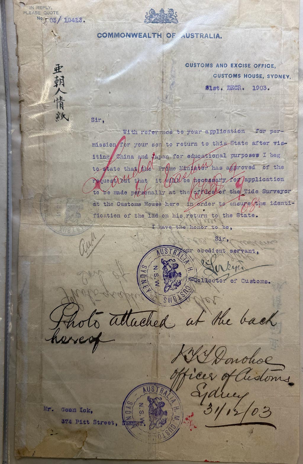 In 1903, Goon Ick submits an application for permission for his son Walter Goon Ick to visit China and return to the Commonwealth. The application is successful with the condition that they secure his identification when he returns to Australia4.