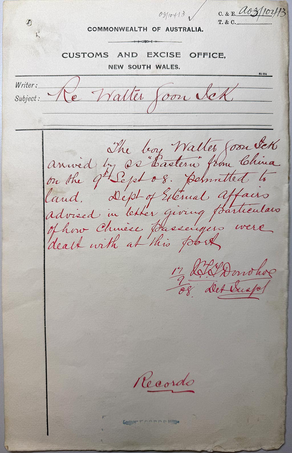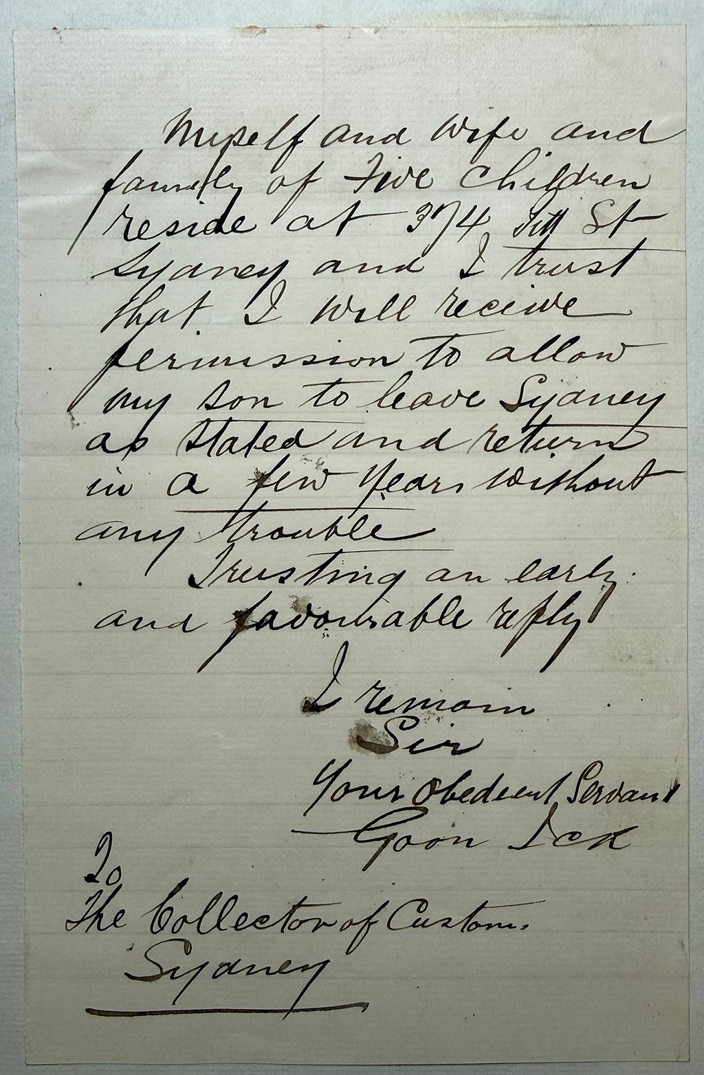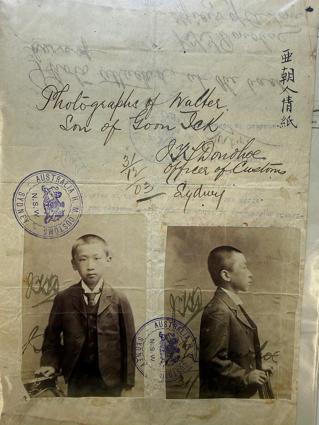 In 1903, Goon Ick submits an application for permission for his son Walter Goon Ick to visit China and return to the Commonwealth. The application is successful with the condition that they secure his identification when he returns to Australia4.