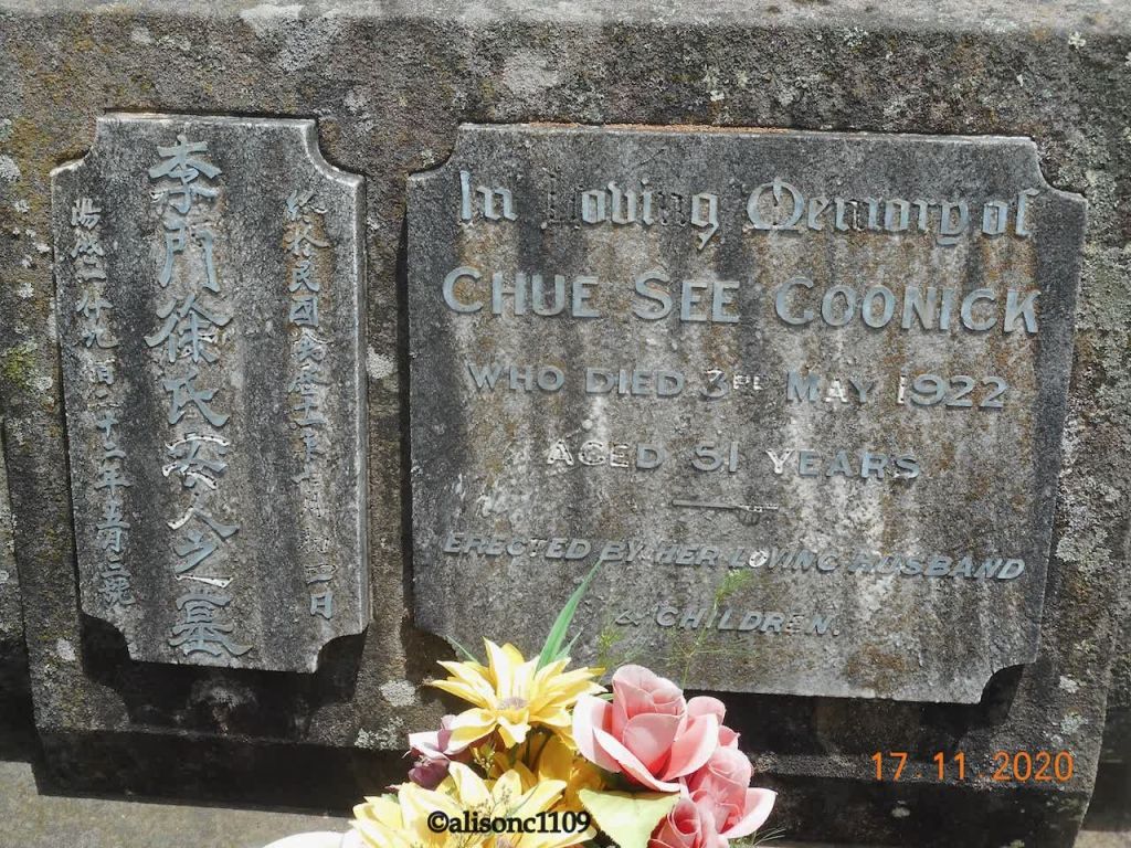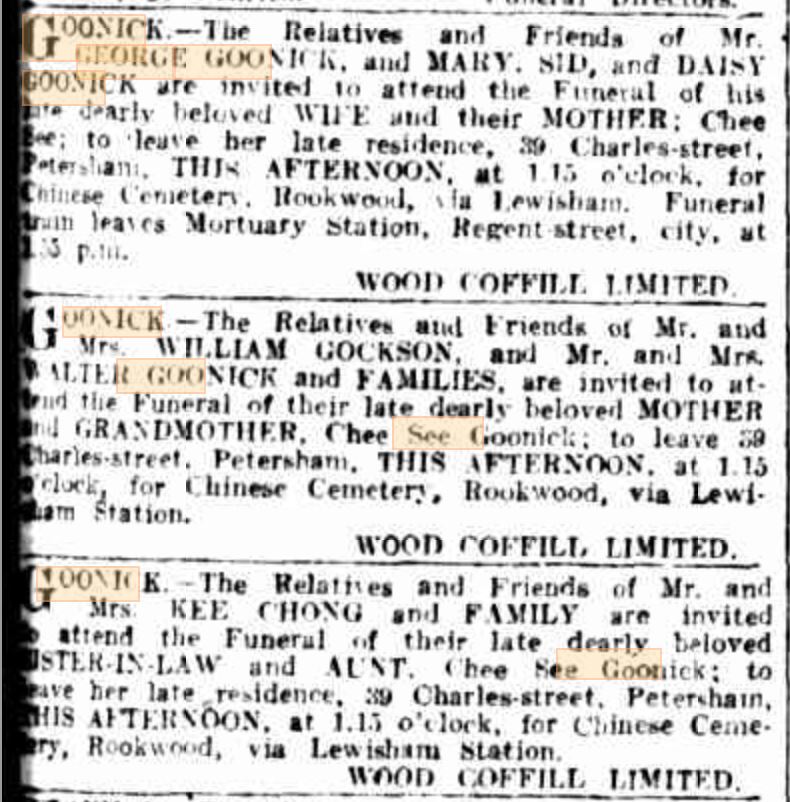 On May 3, 1922, Chee See, Goonick’s wife, died at the age of 51 and was buried at Rookwood General Cemetery.