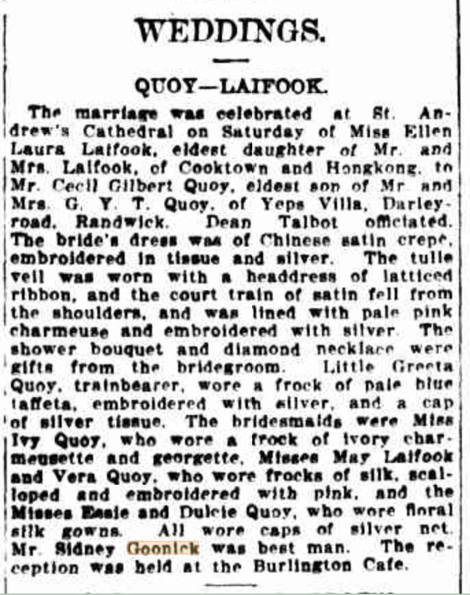 In 1895 a second daughter, Mary Lee Goonick, was born. Mary later marries Percy Gock Bew (Kwok) the son of George Kwok Bew 郭標 (aka Guo Biao – Founder of Sydney’s first fruit and vegetable wholesale store, Wing Sang and Co)