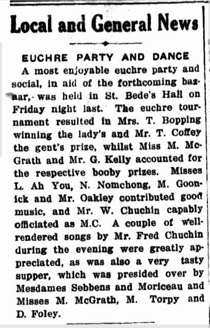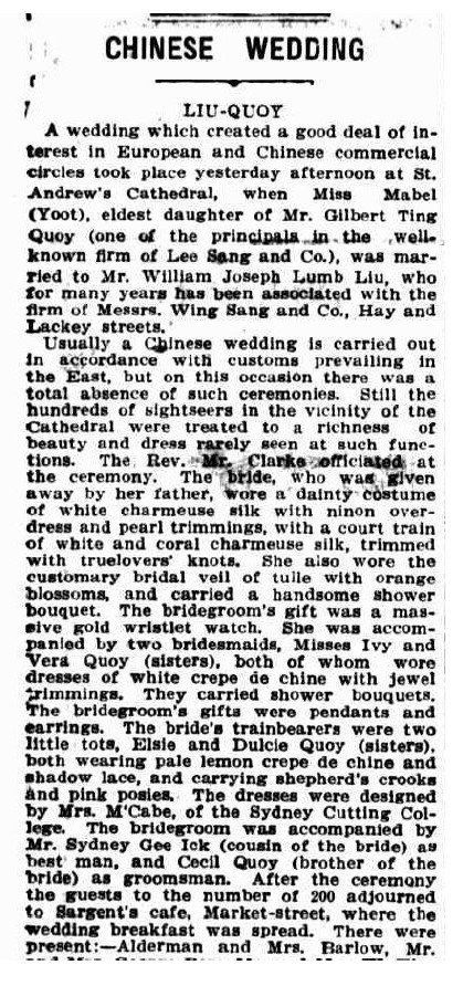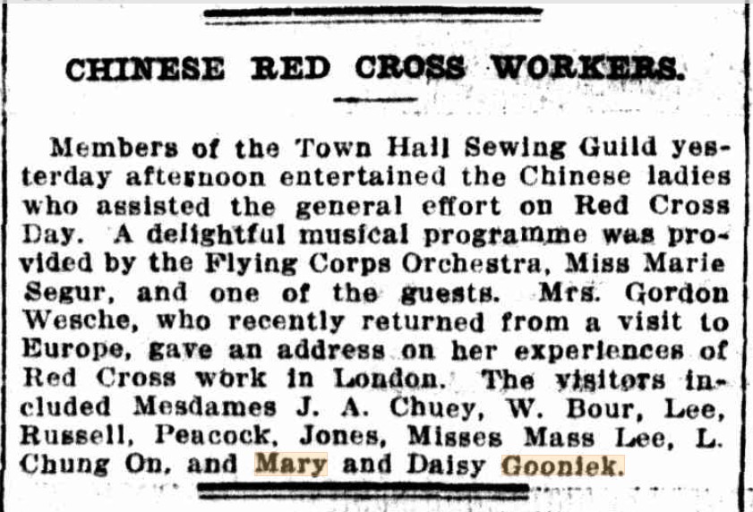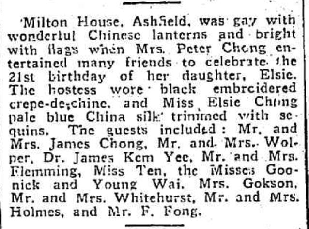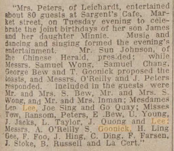 The newspaper articles below demonstrate how engaged and interconnected the Goonick children were with the Chinese community, highlighting several close family ties that developed through weddings and party engagements.